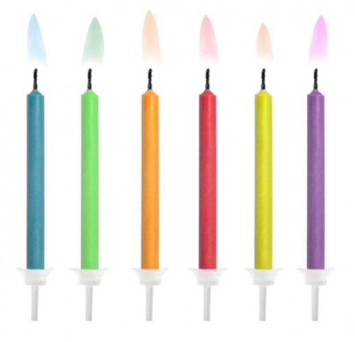 Narozeninové dortové svíčky, mix barev. Po zapálení je plamen různě barevný.